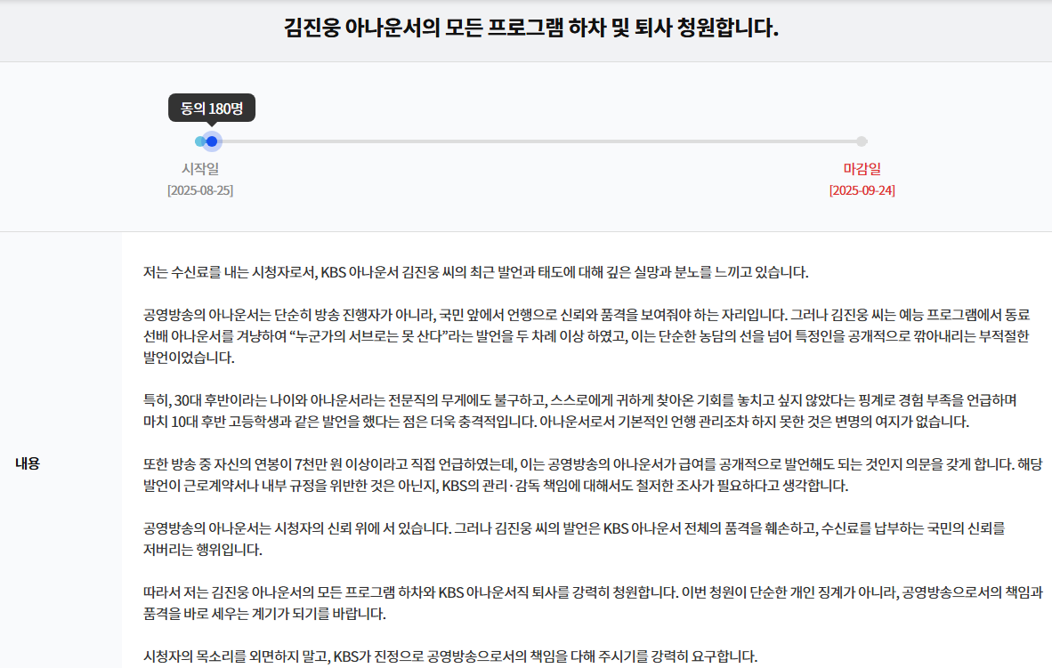 8월 25일 KBS 시청자 청원 게시판에는 ‘김진웅 아나운서의 모든 프로그램 하차 및 퇴사 청원’ 글이 게시됐다. 청원인은 수신료를 내는 시청자 입장에서 공적 매체 아나운서의 언행을 문제 삼으며 조치를 요구했다. 이 청원 제도는 30일 내 1,000명 이상 동의 시 해당 부서 책임자가 직접 답변하는 구조다.
