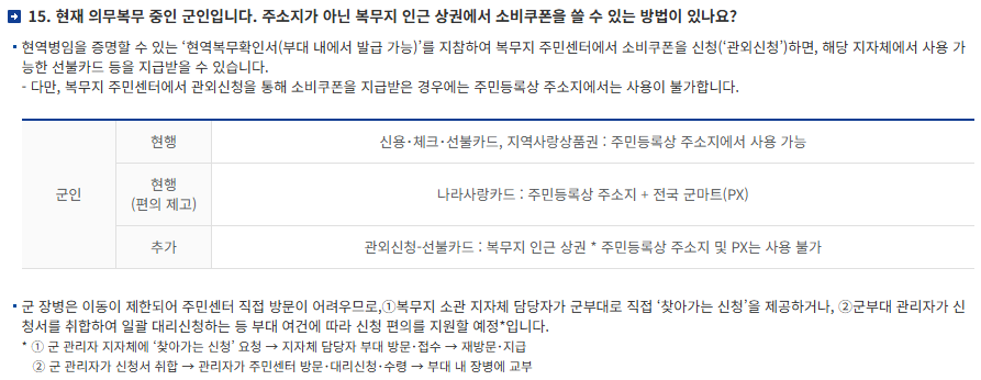 - 복무지 주민센터 ‘관외 신청’으로 복무지 선불카드 수령 → 복무지 상권에서 사용(주소지 사용 불가). PX 사용 특례(나라사랑카드) 병행 안내.
