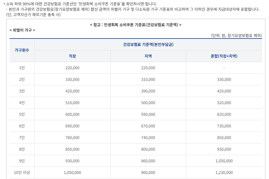 - 대상: 가구 합산 소득 하위 90% 국민.
