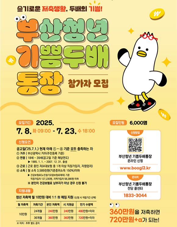 ‘청년 기쁨두배통장’은 부산에 거주하는 청년이 2년간 매달 10만 원씩 저축하면, 부산시가 동일 금액(10만 원)을 매칭해 총 480만 원(원금 240만 + 지원금 240만)을 만들 수 있도록 지원하는 자산형성 매칭통장입니다.