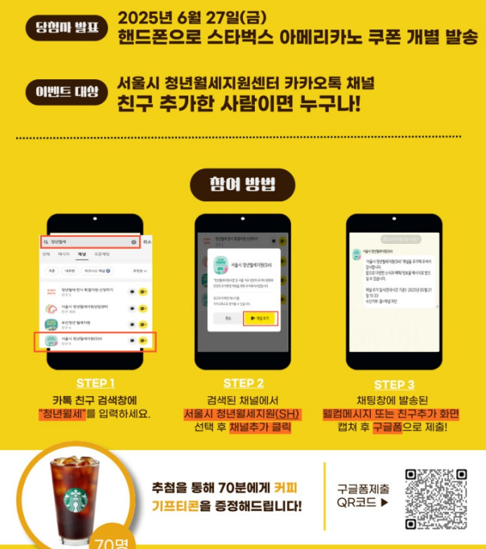 2025년 서울시 청년월세지원사업 신규 모집을 맞아 카카오톡 친구 추가를 하면 시원한 아이스 아메리카노를 쏜다고 합니다!