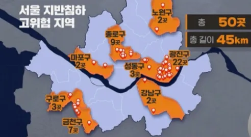 이들 지역은 지하철 객차, 터널, 건물 지하주차장, 노후 상하수도가 겹치는 ‘지반 다중취약지’입니다.