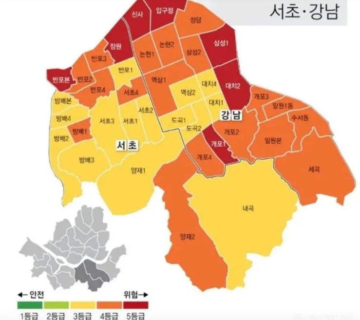 위험 5등급 동이 밀집한 곳은: 반포본동·대치2동·압구정동·잠실2동·삼성1동·공덕동 등