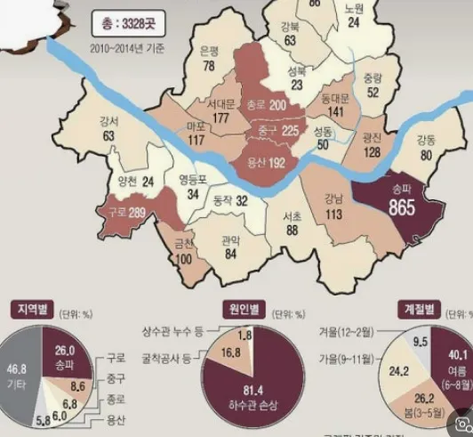 2014~2023년 서울에서 발생한 싱크홀은 총 216건, 광주·부산·대전보다 많았으며, 이는 한강 매립지 특성 + 잦은 지하 공사 때문입니다