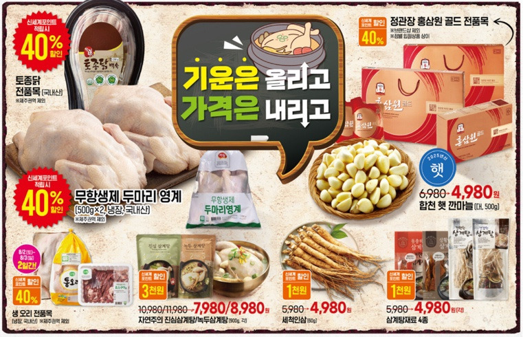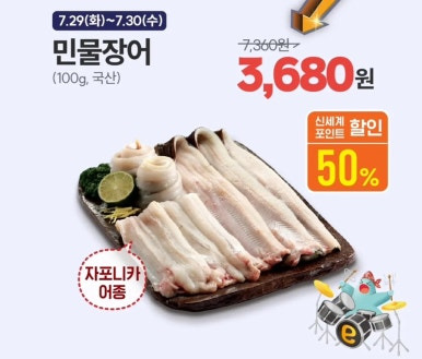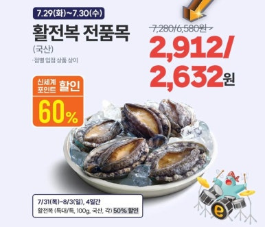 - 전복: 60% → 2,912원 / 2,632원, 장어: 50% → 3,680원