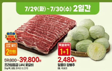 | 7/29~30 (2일) | 수입 삼겹살·목심 (100g 냉장) | 60% 할인 → 788원 | 행사카드 결제 시 |