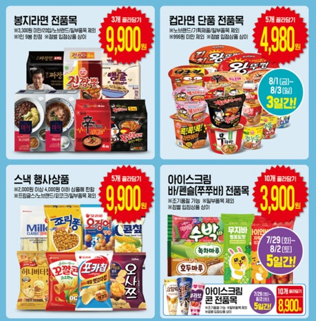 - 봉지라면 3개 9,900원, 컵라면 5개 4,980원, 아이스크림 10개 3,900원 등