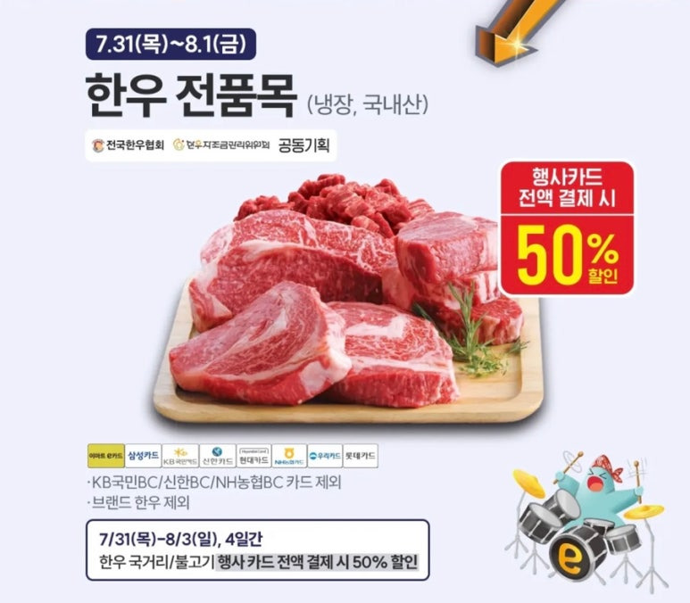 | 냉장 한우 전품목 (브랜드 제외) | 약 50% 할인 | 행사카드 또는 포인트 | |
