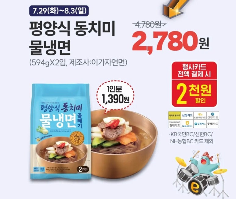 - 평양식 동치미 물냉면(594g×2입): 2,780원, 오뚜기 콘치즈 피자: 2,980원