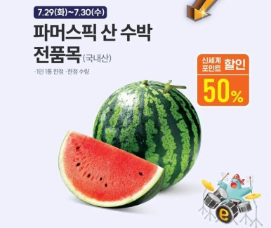 | 파머스픽 산 수박 | 50% 할인 → 1만5,450원 (1인 1통 한정) | 신세계포인트 적립 시 | |