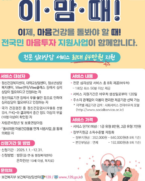 이에 보건복지부는 ‘정신건강은 사회가 책임져야 할 공공의 문제’라는 인식을 바탕으로, 2023년 시범 운영을 시작으로 2024~2025년까지 전국 확대를 목표로 한 ‘전국민 마음투자 지원사업’을 추진하고 있습니다.