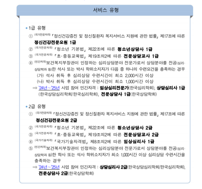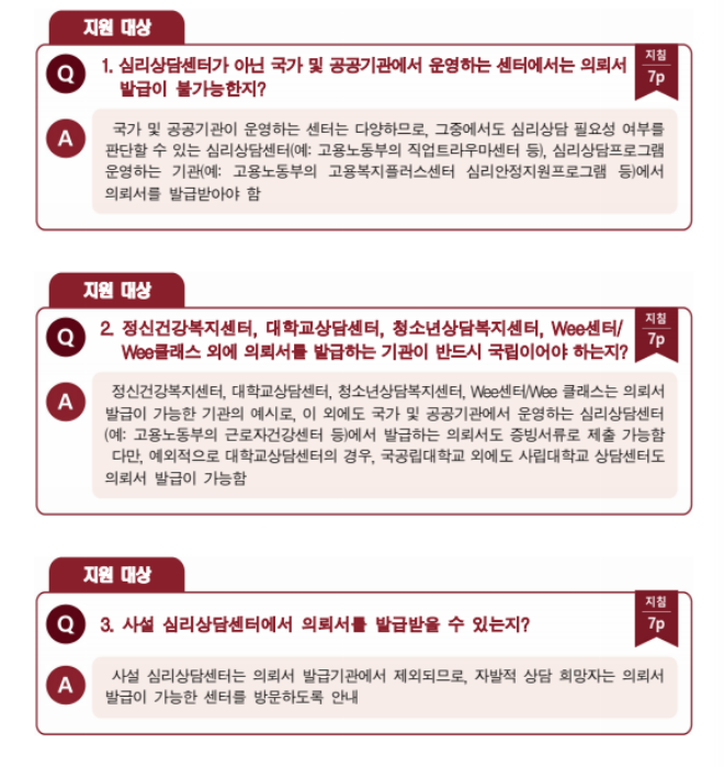 - 상담 방식: 1:1 대면이 원칙이나, 기관에 따라 화상/전화 일부 병행 가능