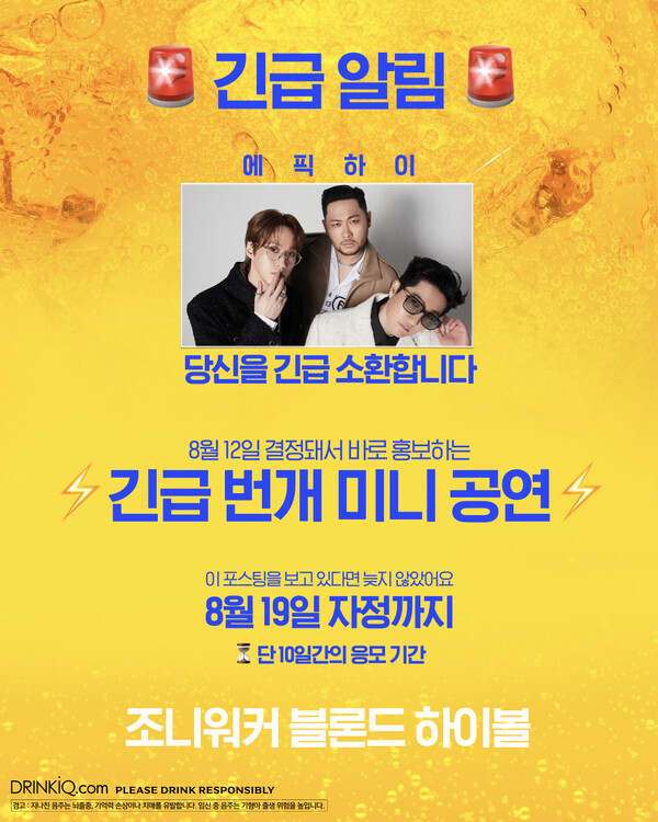 오는 8월 22일 금요일 밤, 조니워커 블론드가 에픽하이와 함께 깜짝 게릴라 공연을 엽니다. 장소는 비공개, 당첨자에게만 안내되는 시크릿 베뉴. 입장과 동시에 블론드 하이볼 파티로 워밍업한 뒤 라이브 셋으로 직행합니다.