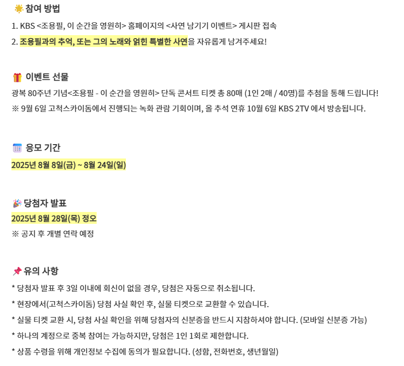 1차 오픈이 순식간에 매진되자 KBS는 추가 증정 이벤트를 다각도로 열었습니다. 사연·애장품·명곡 투표·커버곡·라디오 사연 등 5종 이벤트가 확인되며, 각 이벤트는 추첨으로 공연 티켓(보통 1인 2매)을 제공합니다. 대부분 8/24(일) 전후 마감으로 공지되어 있으니 기간 내 참여가 필요합니다.