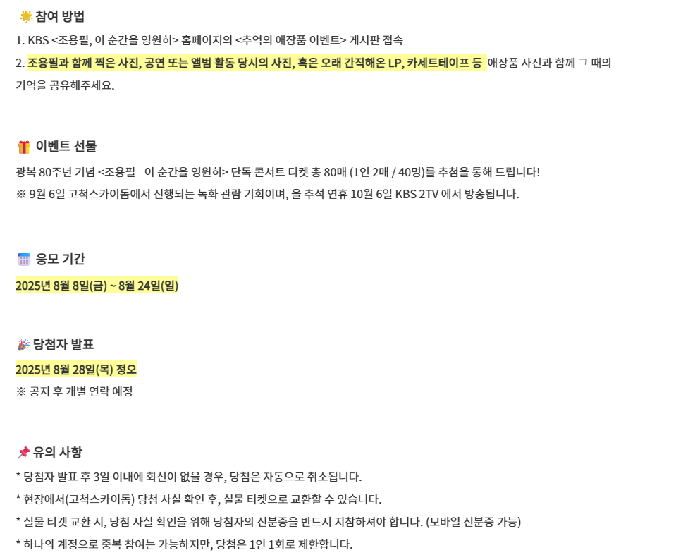 - 무엇: 조용필과 얽힌 나만의 이야기(공연·가족·인생곡 추억 등)를 남기면 추첨으로 티켓 증정.