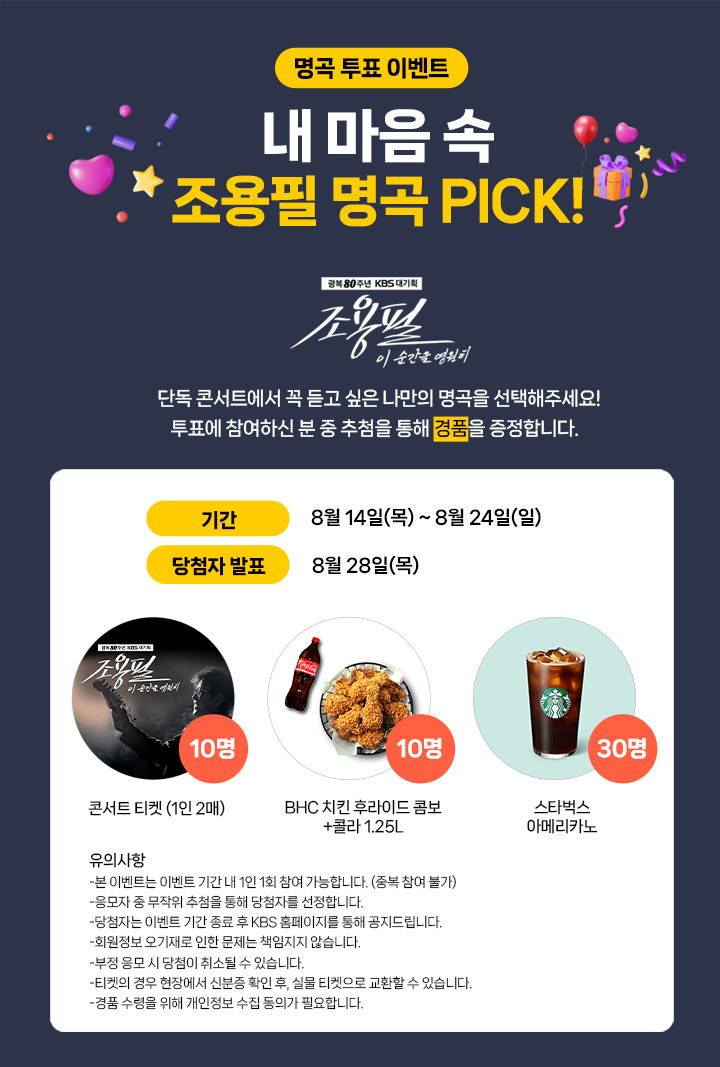 - 무엇: 옛 티켓, 포토, LP/카세트, 팬클럽 굿즈 등 조용필 관련 애장품 사진·사연을 올리면 추첨 증정.