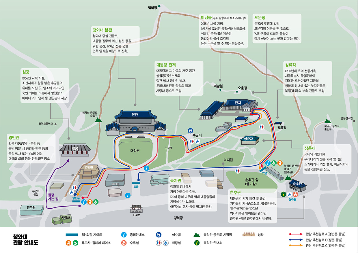 - 정문 → 본관 → 녹지원 → 관저 → 춘추관
