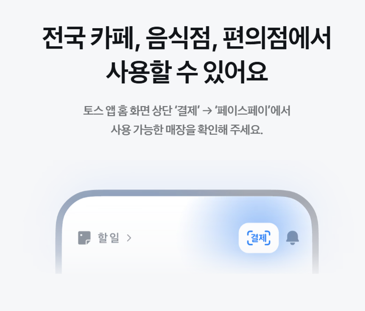 - 토스 앱 검색창에서 ‘페이스페이’ 입력 → 안내에 따라 얼굴 인증 + 결제수단(카드/계좌) 연결 → (신분증 보유) 만 17세 이상 등록 가능.