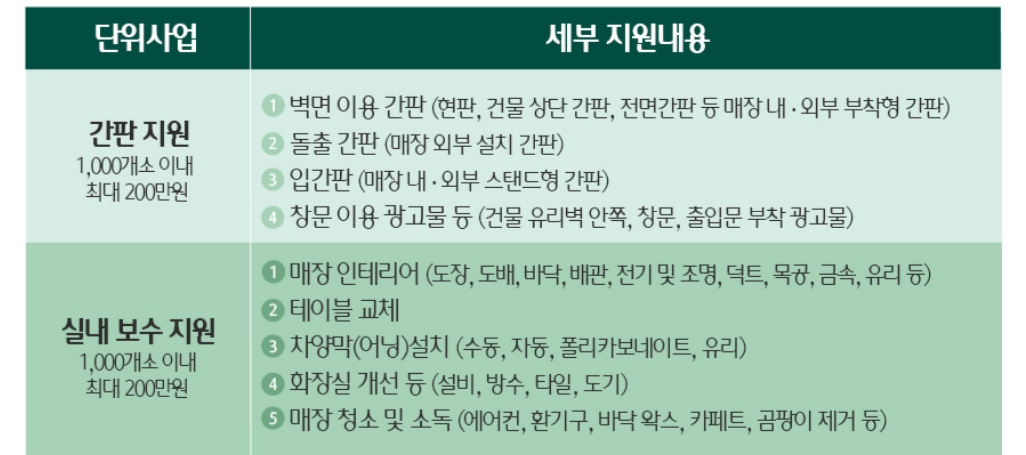 | 실내 보수 | 1,000개소 이내 최대 200만원 | - 매장 인테리어 - 테이블 교체 - 파양막(어닝) 설치 - 화장실 개선 등 - 매장 청소 및 소독 |