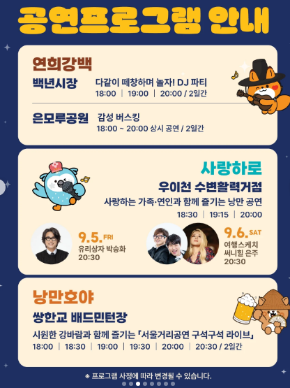 - 9/5(금) 20:00: 유리상자 박승화—우이천 수변에 잘 어울리는 감성 발라드로 오프닝 나잇의 무드를 확 끌어올립니다.