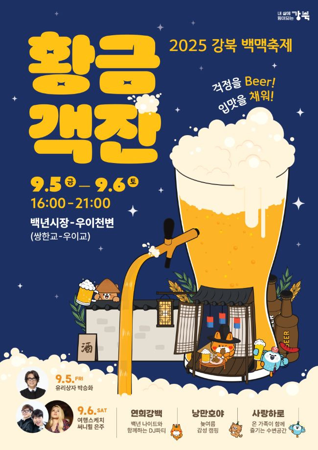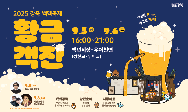강북구가 가을 초입에 꿀 같은 2일을 준비했습니다. 이름하여 ‘2025 강북 백맥축제’. 올해의 슬로건은 “황금객잔: 걱정을 Beer, 입맛을 채워!”로, 백년시장과 우이천 일대를 잇는 축제장에 백 가지 먹거리와 전국 12개 브루어리 수제맥주가 모입니다.