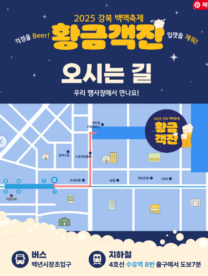 - 백년시장(강북종합전통시장): 서울 강북구 한천로144길 12 일대, 지하철 4호선 수유역에서 도보권(현장 체감 약 10분 내외라는 체험 글 다수). 축제 때는 시장 골목이 안주/분식/전통메뉴 라인의 핵심 거점이 됩니다.