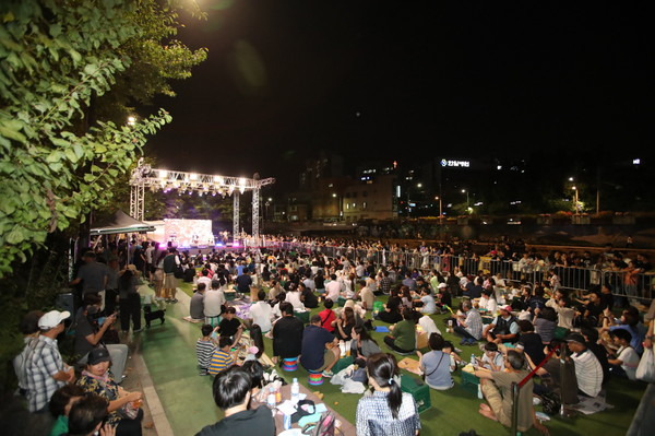 하천 난간·평상·피크닉 테이블이 캠핑 분위기를 만듭니다. 인생샷은 해 질 녘~20시 사이, 공연 전 웜업 타임이 적기.