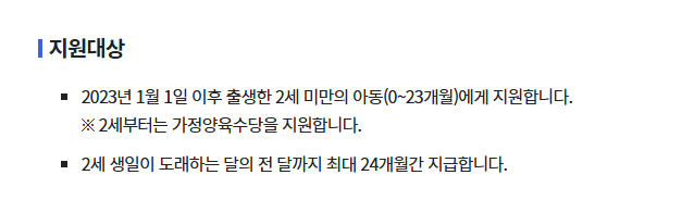 - 대상: 만 0~23개월(2세 미만) 영아 → 부모·조부모 등 양육자