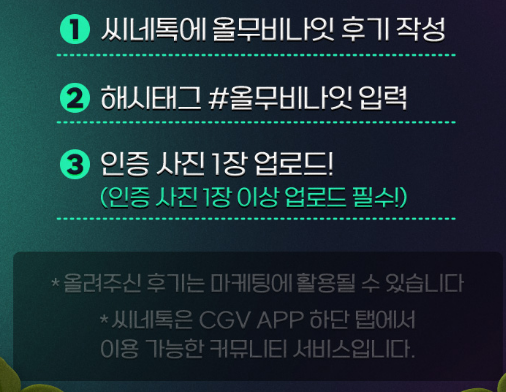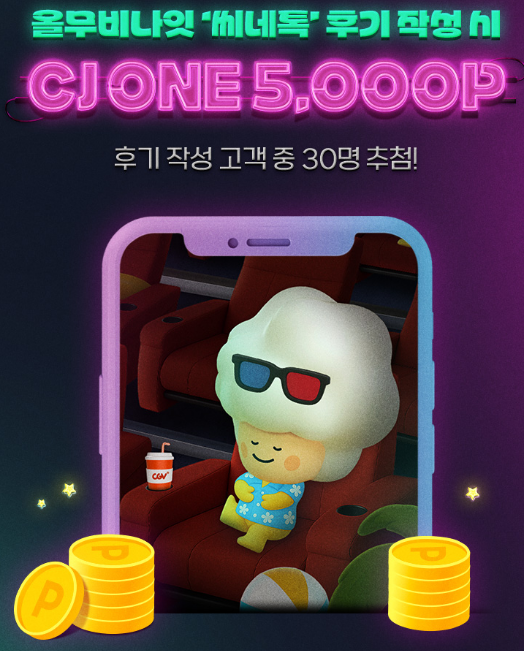 - 후기 이벤트: 올 무비 나잇 씨네톡 후기를 남기면 CJ ONE 5,000P 추첨 증정. 관람 기록을 남길 동기부여가 됩니다.