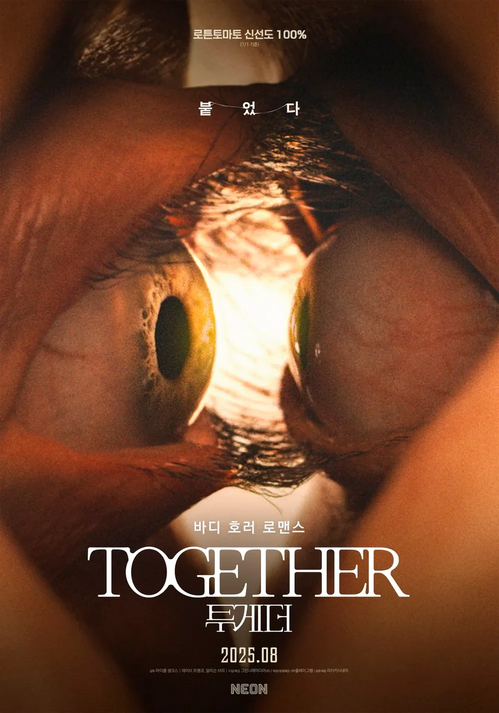 투게더는 관계의 파국을 ‘신체적 결합’이라는 바디 호러 은유로 밀어붙이는 영화. 102분에 걸친 장르 혼종이 독특해, 공포 위주 편성에 신선한 변주가 됩니다.