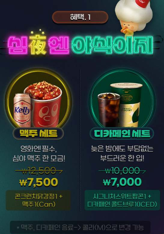 - 스낵/드링크 특가: 맥주 1캔+스낵 1종=7,500원, 디카페인 콜드브루+스위트 팝콘=7,000원. 씨네톡 후기 작성 고객 대상 CJ ONE 5,000P 추첨 증정.
