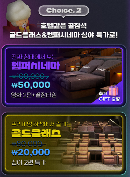 - 프리미엄 숙면 플랜(템퍼시네마 한정): 1편 관람 → ‘꿀잠 타임’ → 2편으로 마무리. 오후 11시~오전 6시 패키지로 설계돼 있어 체력 방전에 유리.