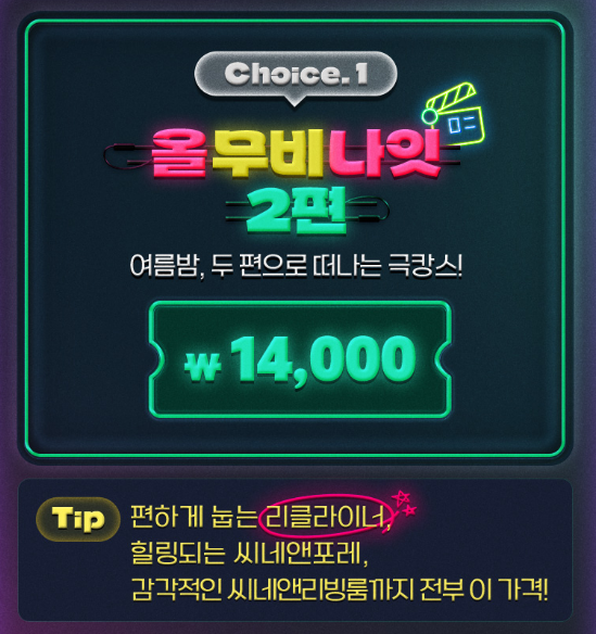 - 어떻게 보나? 5편 라인업 중 2편을 골라 연속 관람(심야 패키지). 가격 1만 4천 원.