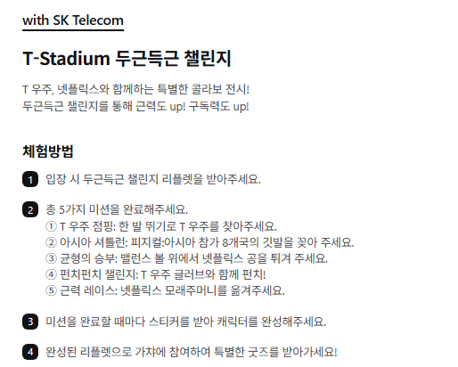 SK텔레콤은 〈피지컬: 아시아〉의 팀 대항전 콘셉트를 살려, 실외 마당+실내 2층으로 나눠 다섯 가지 피지컬 훈련을 즐기는 ‘도전의 경기장 T-스타디움’을 꾸몄습니다. 현장에선 ‘득근(=근육 득템)’ 리플렛을 받아 미션을 찍고 깨면 됩니다.